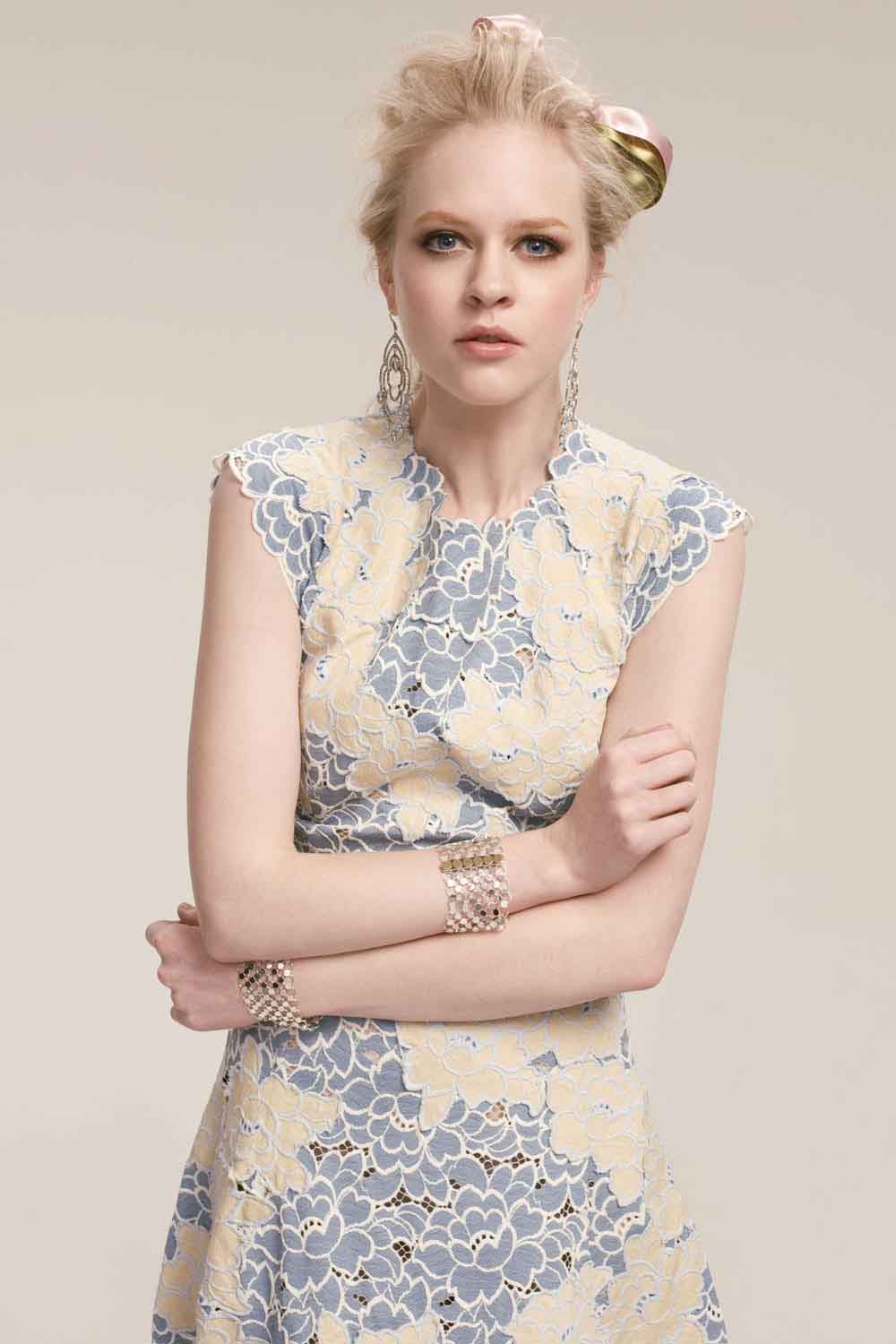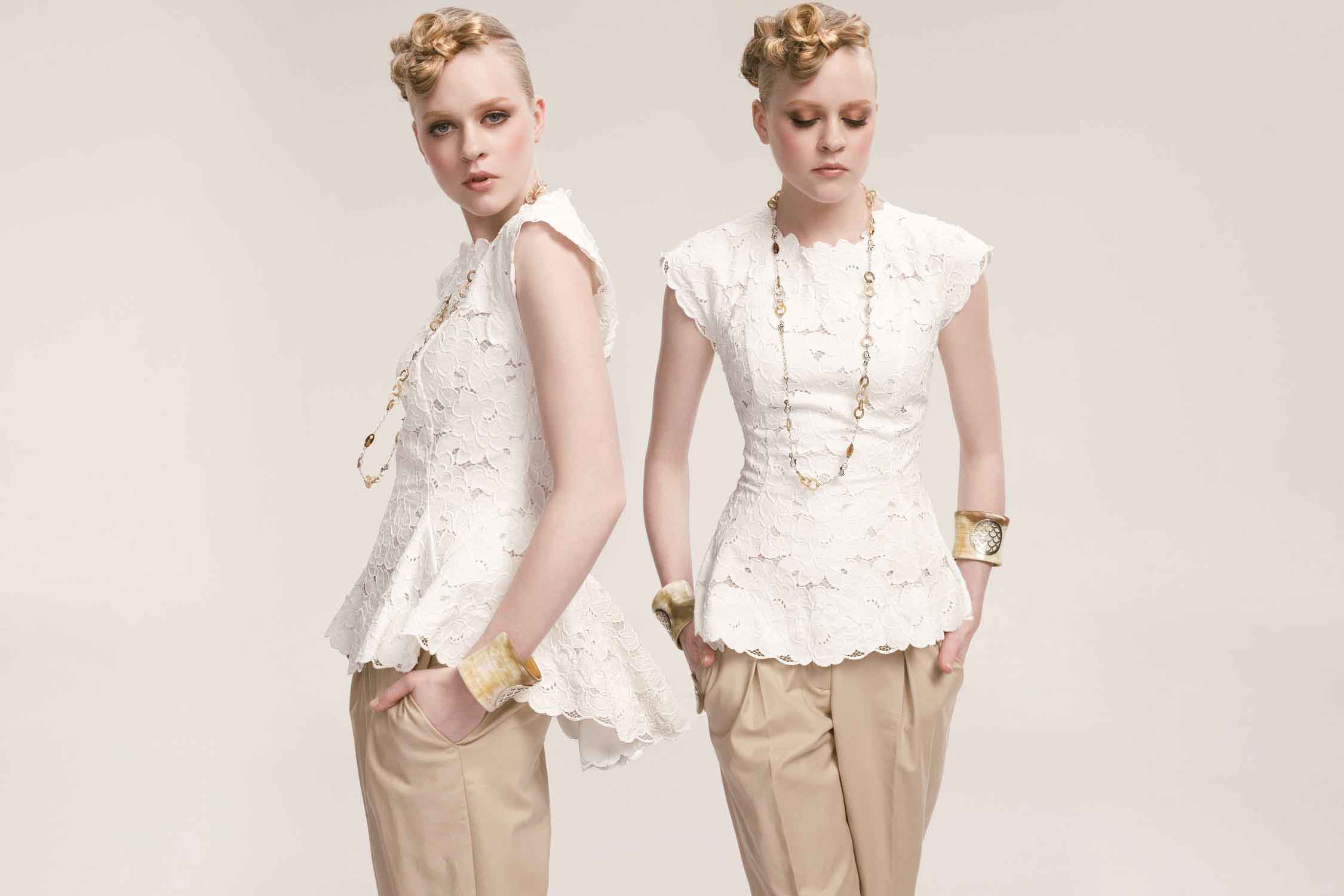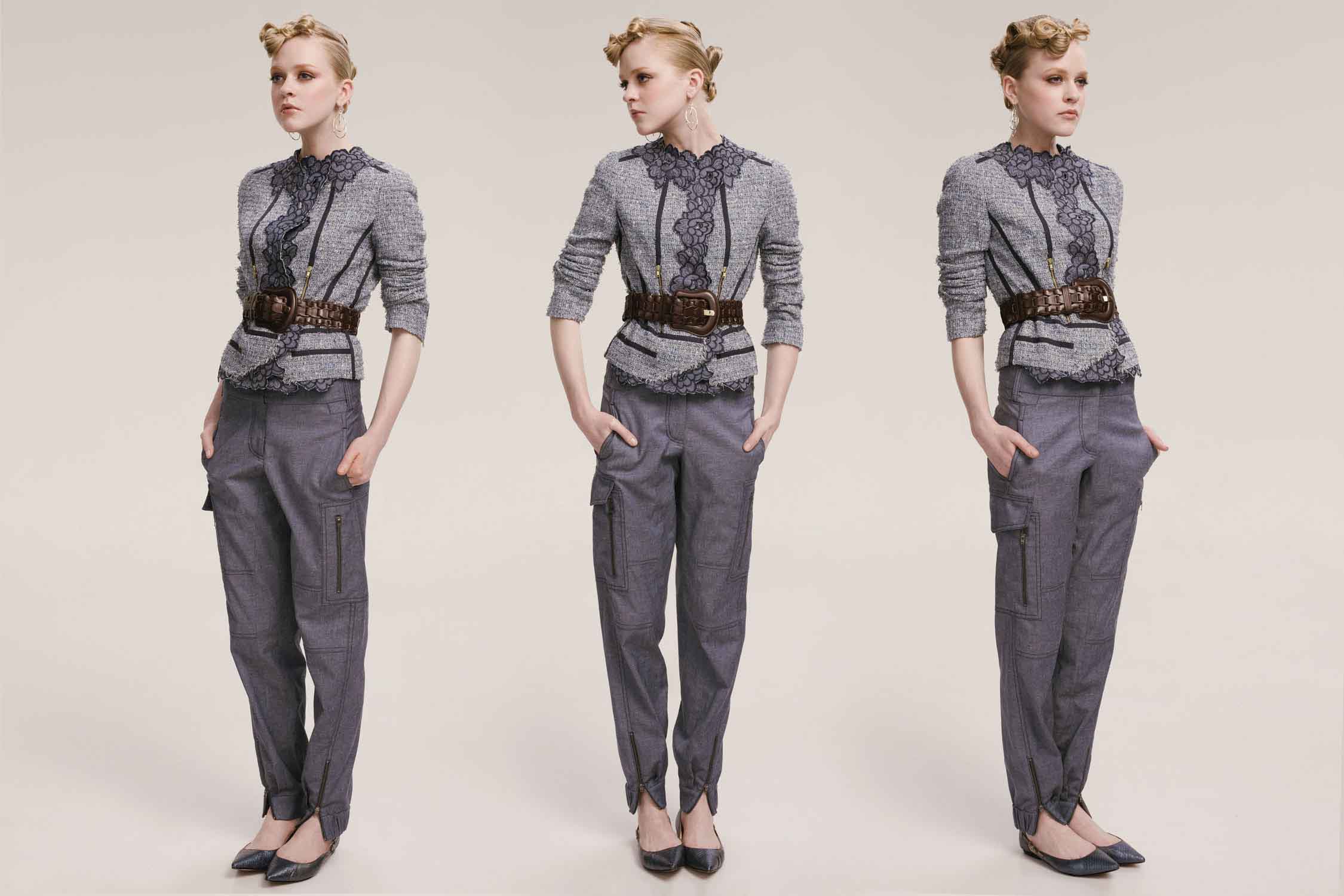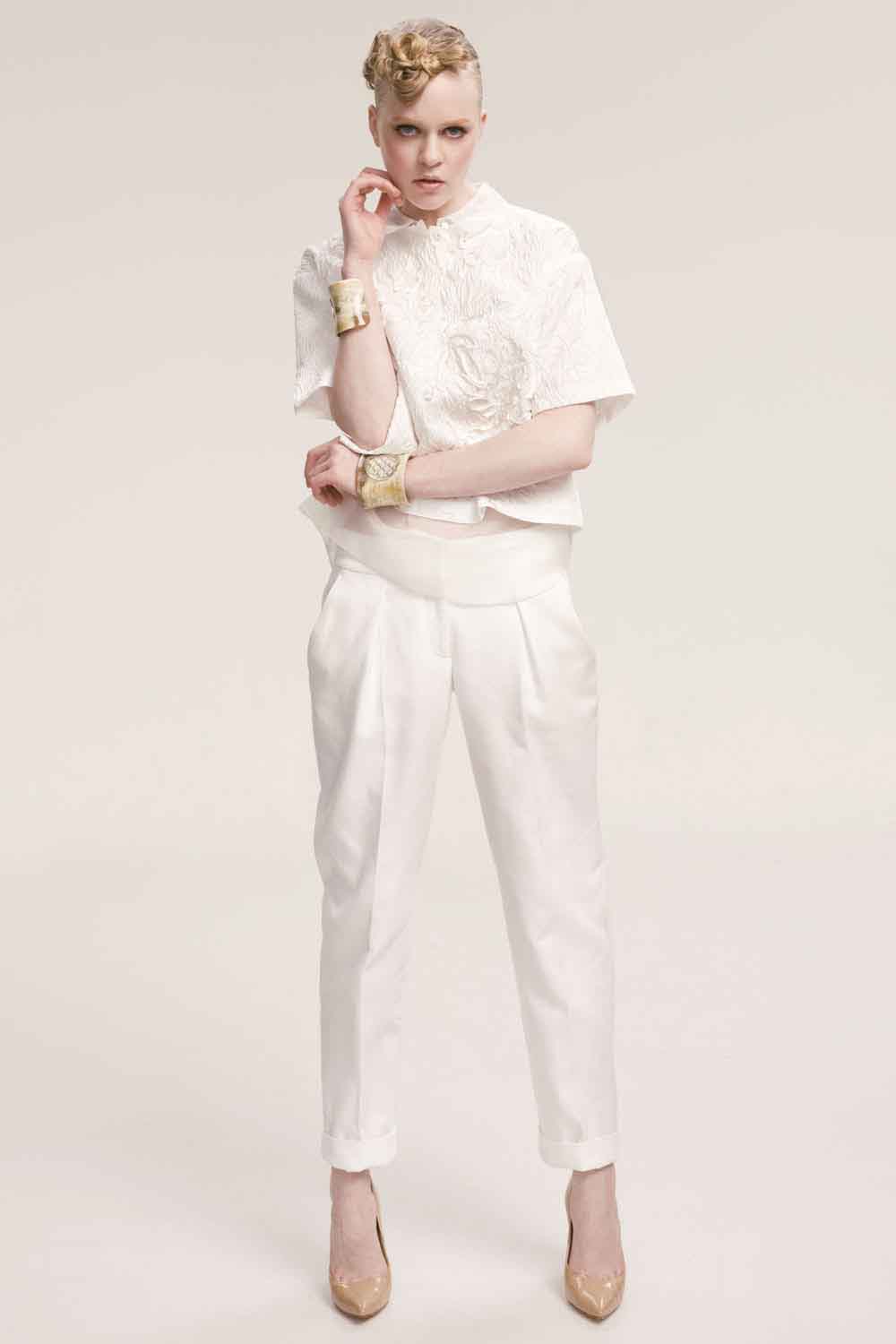 Celebrating spring with a juxtaposition of couture and casualwear, creating an elegant yet highly wearable urban collection. Couture fabrics; floral moiré, silk organza, rich jacquard, thick lace and opulent silk, are given an unusual casual interpretation. Thick couture lace is mixed with denim and cut to make sharp looking essembles, while fluid rich crepe de chine is tailored into functional cargo pants, and intricate embroidery is applied on casual tweed. Silhouette is a sporty yet elegant, with fit and flare being the predominate silhouette. Couture becomes casual and convenient for everyday dressing.